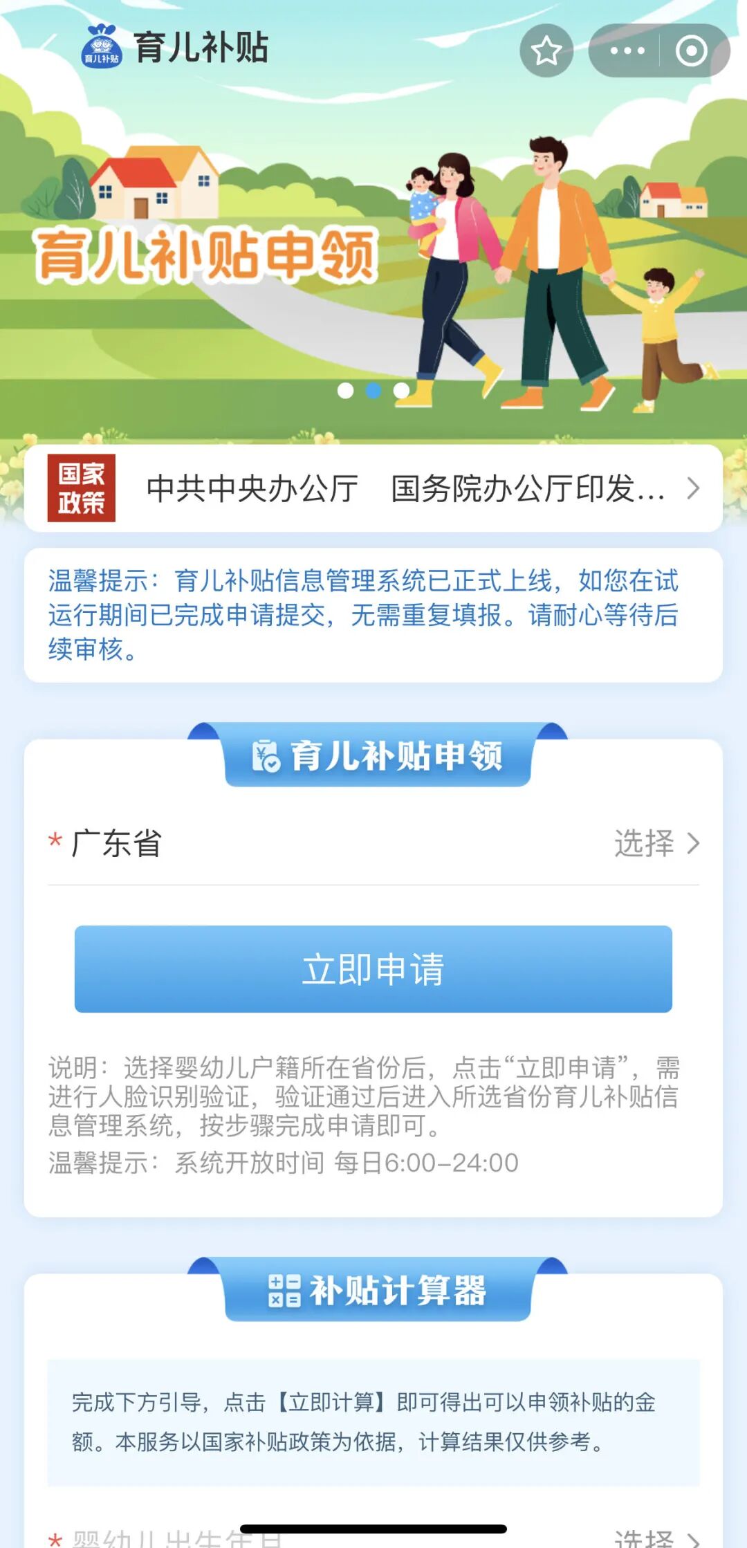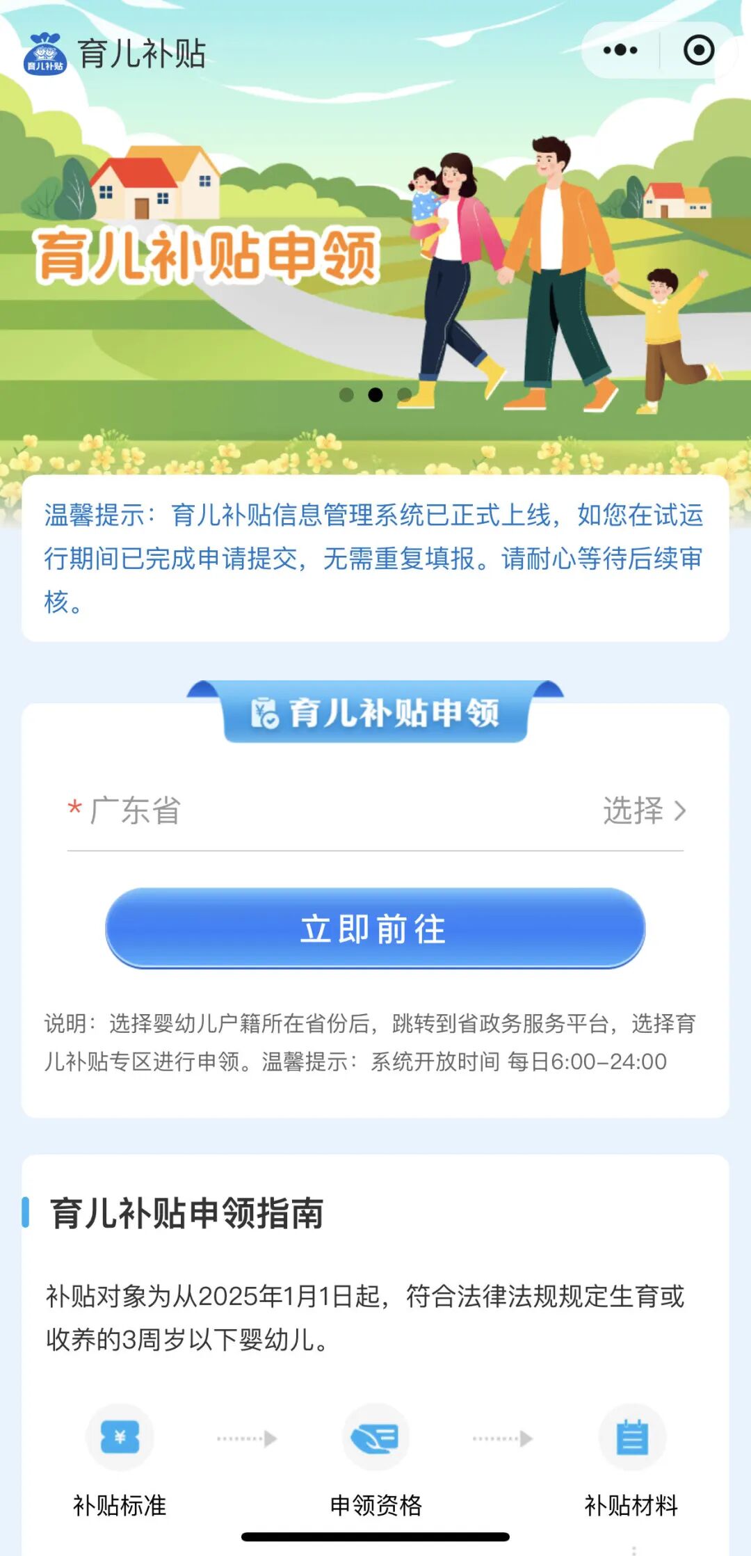 此外,微信“育儿补贴”小程序目前也已经上线,页面显示,选择申领省份后,将跳转到省政务服务平台,选择育儿补贴专区进行申领。