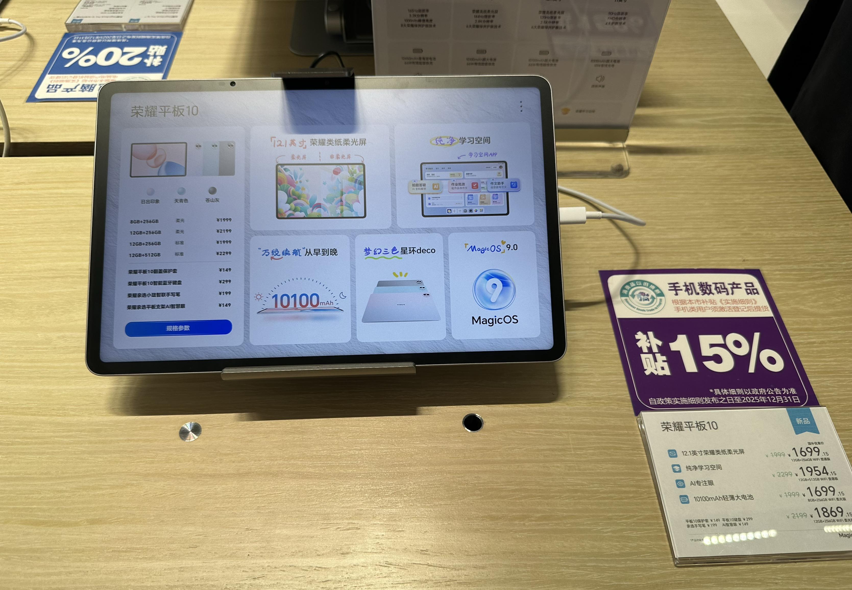 (上海一家荣耀授权体验店摆放的荣耀平板10 财联社记者摄)
